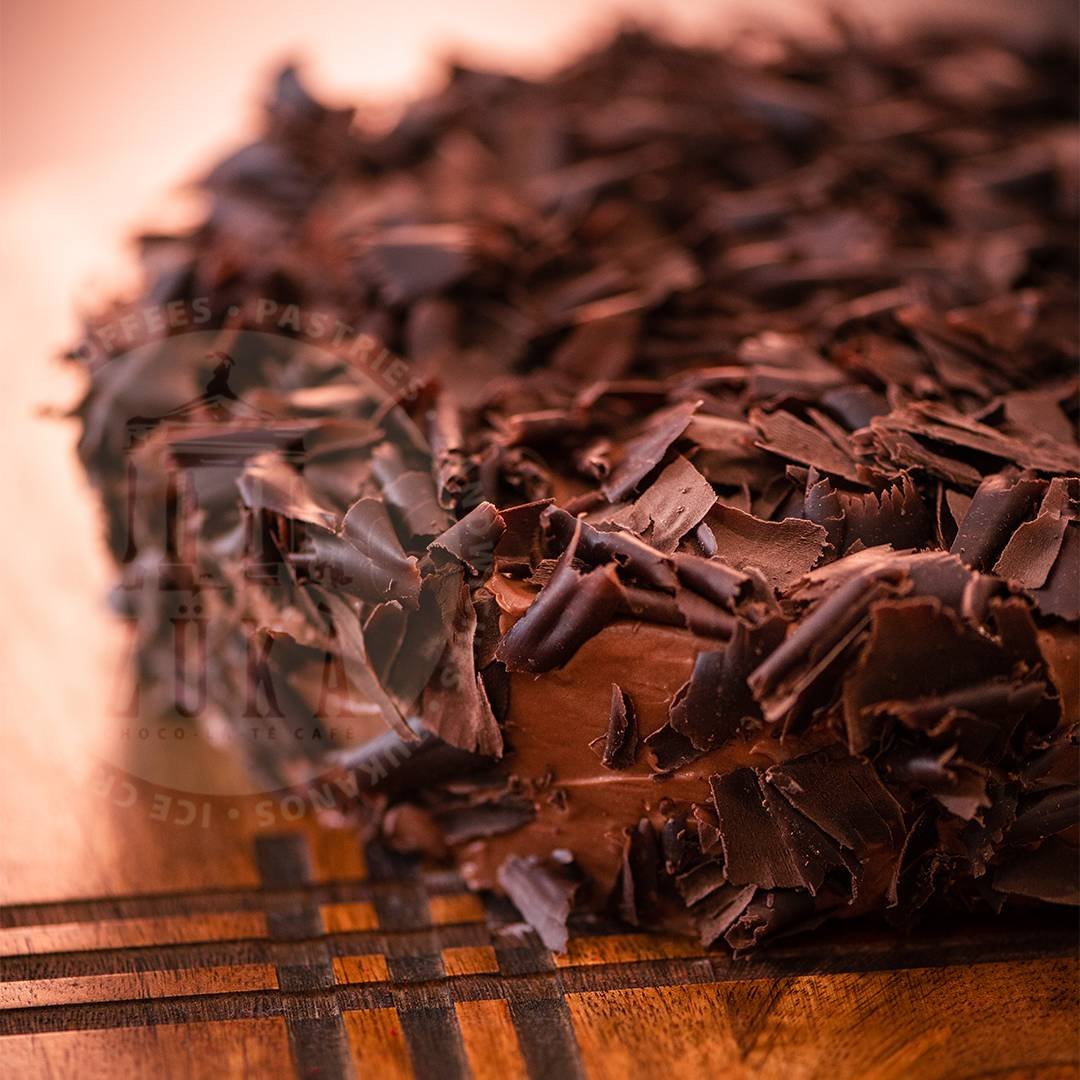 Moist cocoa cake sponges layered with lush Belgian chocolate ganache, enrobed in velvety chocolate mousse and finished with a delicate blanket of chocolate shaving.